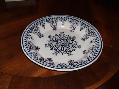 0 meu prato decorativo. Não sou fã desta loiça, pela exuberância do azul- nalguns casos chega ao berrante...desculpem - contudo gosto de algumas peças, nomeadamente deste prato pela elegância contorneada da aba, do desenho miúdo e da palete de cores.