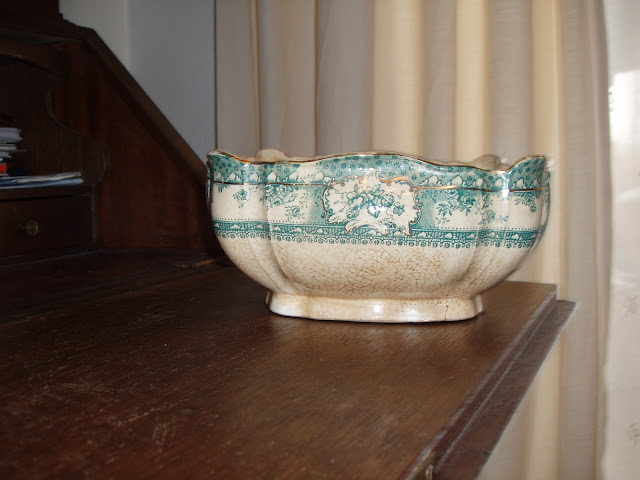 Esta travessa motivo Chorão foi-me vendida na feira da ladra. O vendedor enganou-me - estava restaurada - só vi quando a pus de molho em casa...caríssima. Infelizmente foi roubada da casa onde estava