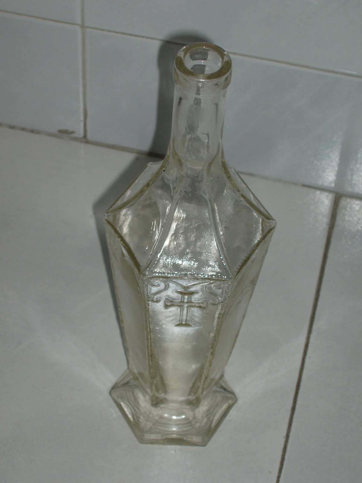 O mais impressionante na garrafa é a presença da Cruz em relevo e nas quinas laivos de cornucópias.Segundo teoria do meu bom amigo Jorge Saraiva devia ser usada em celebrações religiosas ou para colocar o vinho de "missa" (?) Segundo