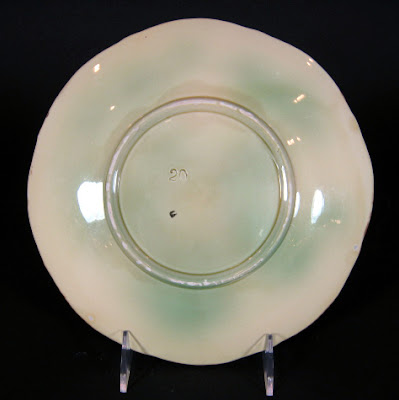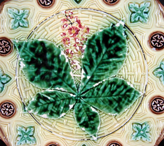 O prato é pequeno, com decoração relevada que irradia do centro com folhas verdes sob fundo picotado em tons verdes e castanho com aba encanastrada e recortada.Tem um esmalte brilhante.