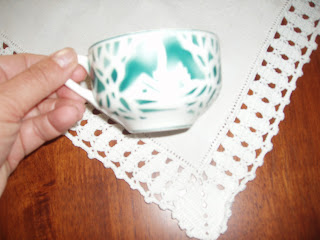 Apaixonei-me pela bordadura em tons de verde.Uma das cores que mais aprecio em faianças.Servia para todos beberem dela à mesa.