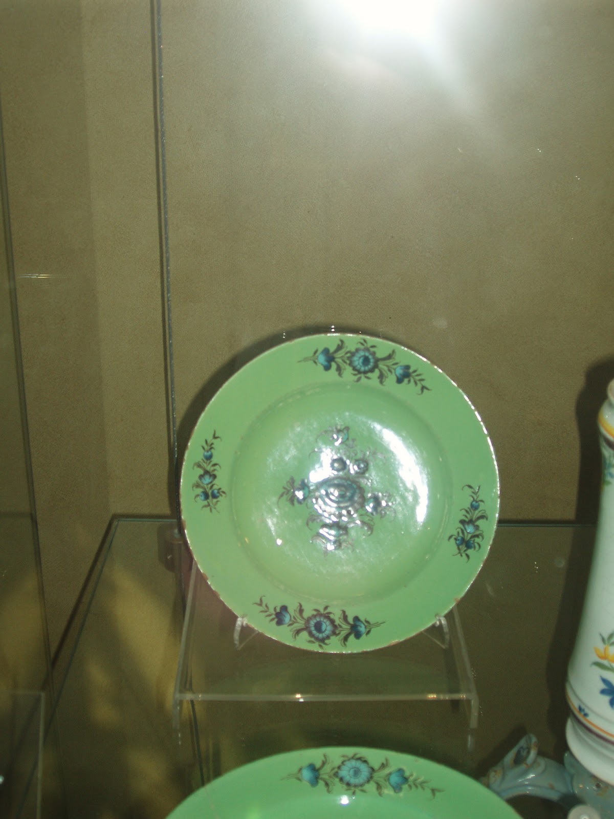 - No 25 de abril na visita que fiz ao Museu de Arte Antiga reparei num prato atribuído à Fábrica Carvalhinho que me chamou a atenção pelas semelhanças quer no vidrado quer até na decoração, embora pintado à mão .A foto é a possível, porque o flash não desligou e deveria!