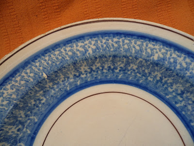 Ornado perto do limite do covo e no rebordo por filete fino em manganês.Dois filetes mais largos em azul limitam uma decoração esponjada na aba e no covo bastante pronunciado.