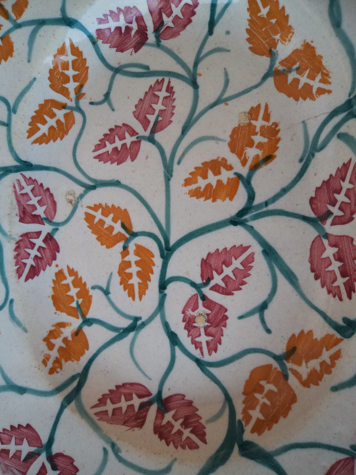 A travessa ofertada, em balanço com o grande prato em baixo. que tem gravado na pasta um minúsculo "A" de Alcobaça (?) ou do nome que o fez? pintor