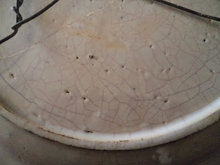 - O esmalte apresenta-se branco brilhante, no verso na aba apresenta partes baças, todo ele esquartejado o que na faiança não é usual, apesar da textura apresentar "buraquinhos e arrepiados"