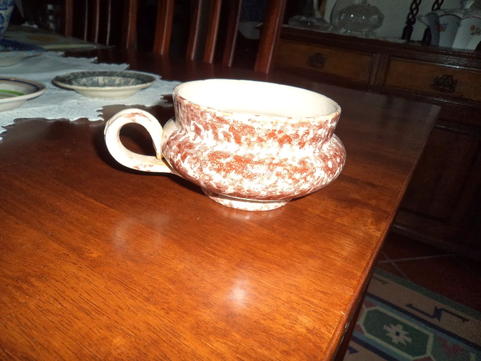 Pintura esponjada em tom monocromático manganês aguado, ornado a filete central, e no limite do bordo numa tonalidade mais escura.