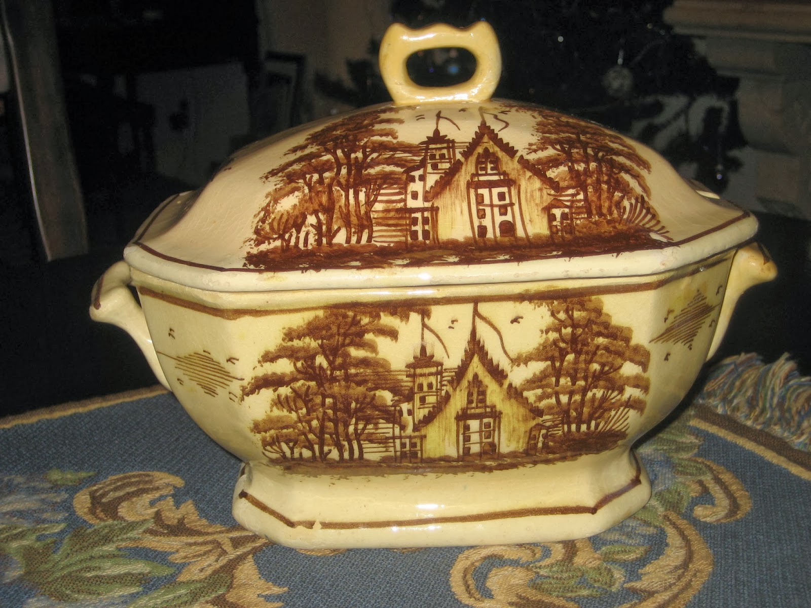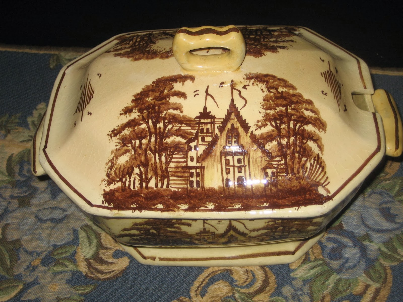 Tampa e terrina da minha coleção, não casam uma com a outra-, só para mostrar a semelhança das cores. A terrina o tardoz tem impresso na massa "1".Ambas as peças podem evidenciar fabrico de Coimbra(?) ou Alcobaça(?).