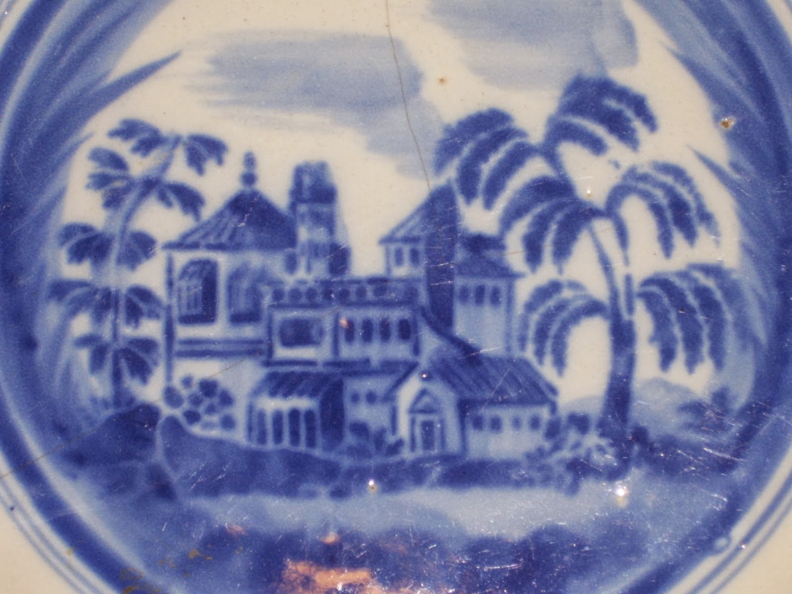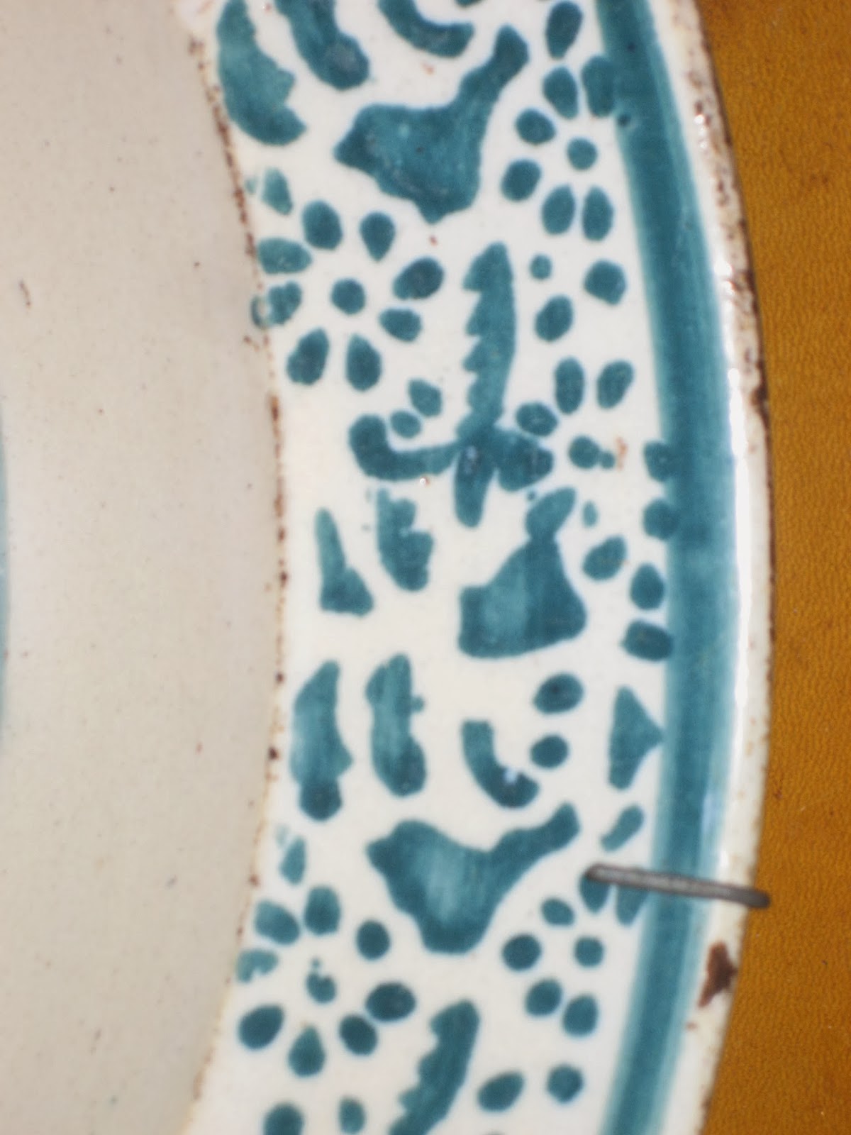 - Avento forte inclinação para produção de Coimbra(?) pelo filete largo da aba, rodapé em esponjado bem pintado, arvoredo de pincelada mais sustentada e pelo formato do casario.O prato ao lado é atribuido a Coimbra(?).