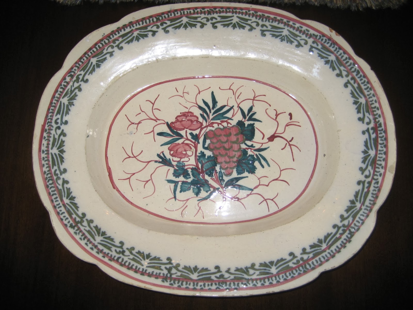 Travessa oval de rebordo recortado. O motivo central de cachos de uvas e gavinhas rosa velho , parras e folhas pontiagudas verdes, delimitado por fino filete rosa velho. Aba com parjela floral verde esbatida encimada por filete fino rosa velho, dentro dele tracinhos que na foto não destingi a cor, mas parece em verde.