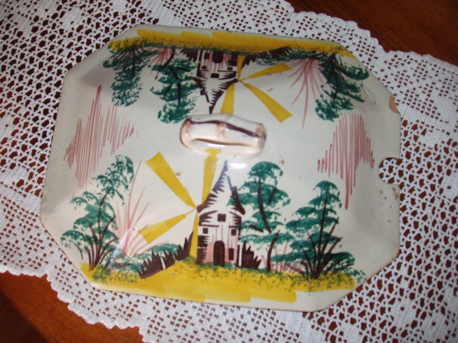 Veja-se a semelhança da pintura de traço a zigue zague ladeado por cruzes na lateral da tampa, apesar da foto não ser muito visível é semelhante à da tampa em baixo que acredito seja de produção de Alcobaça, mais recente do tempo do Manuel da Bernarda.