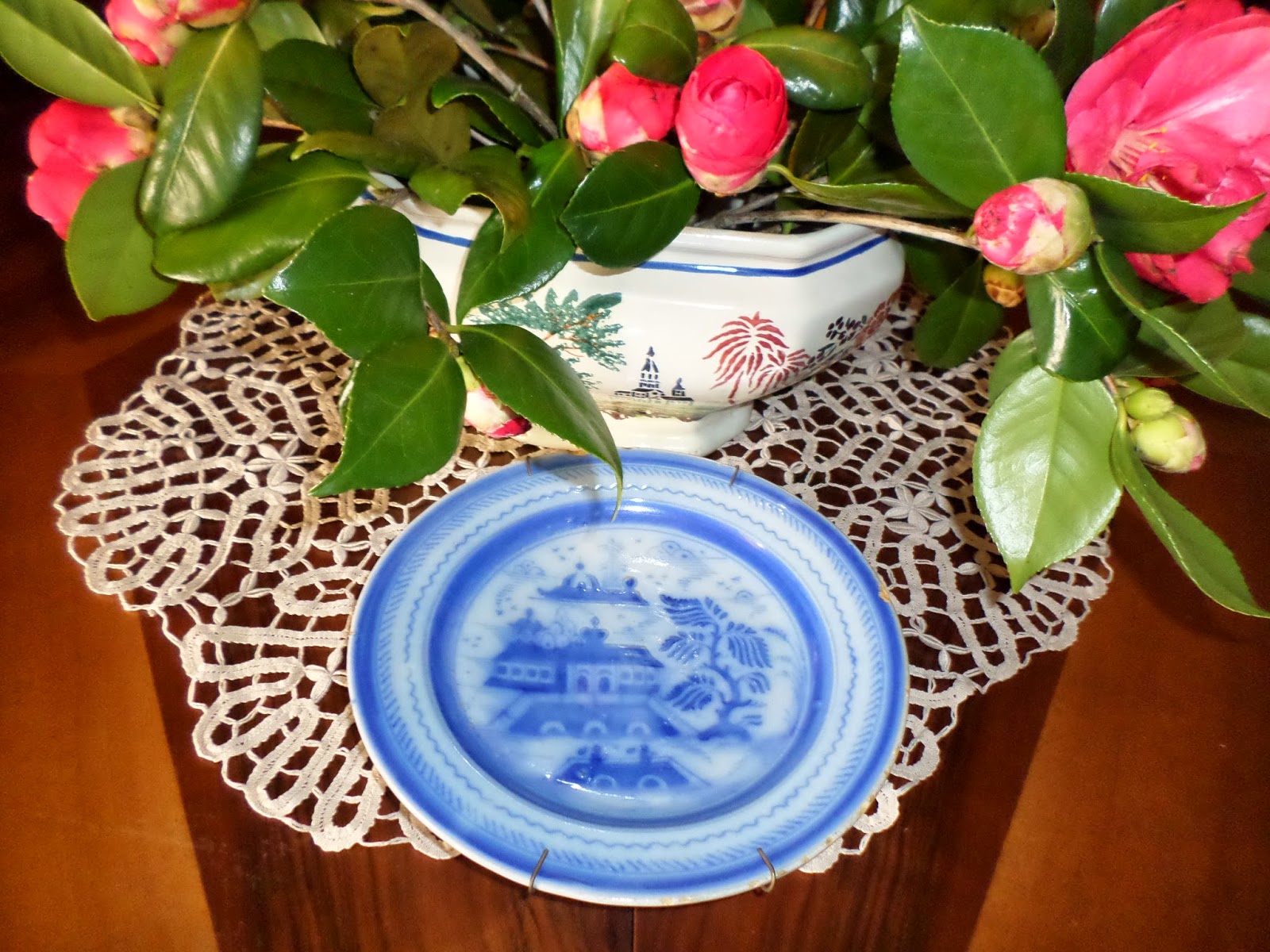 o arranjo floral de camélias que trouxe, e que muitos chama japônicas.