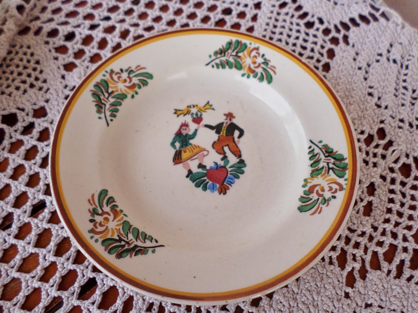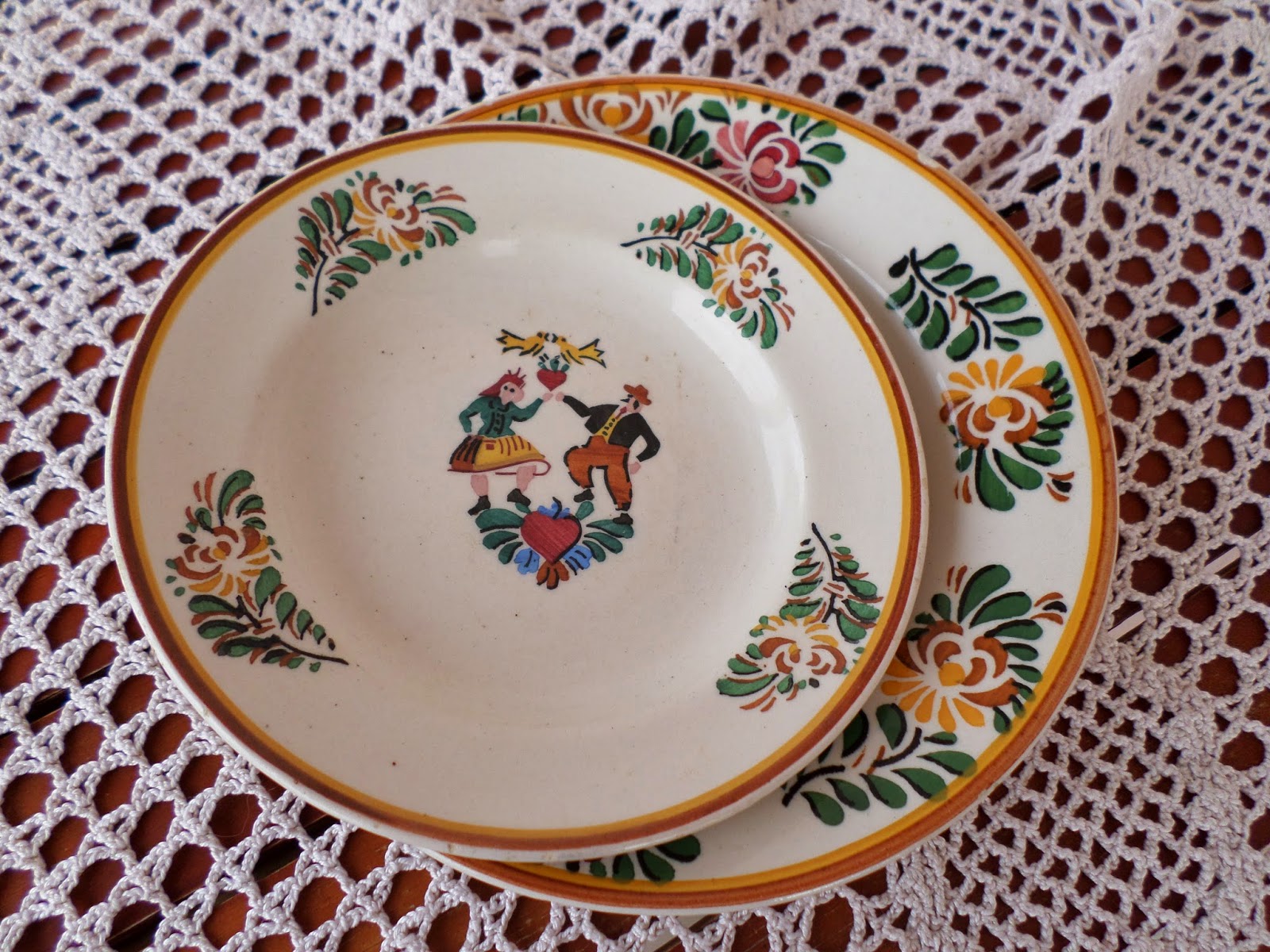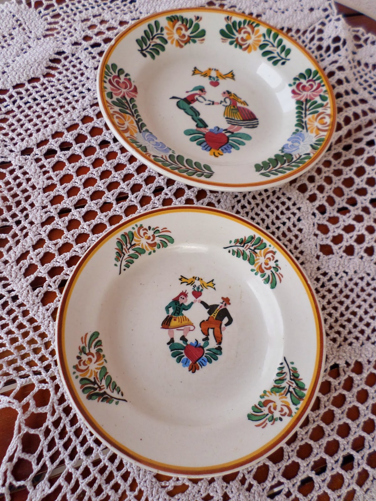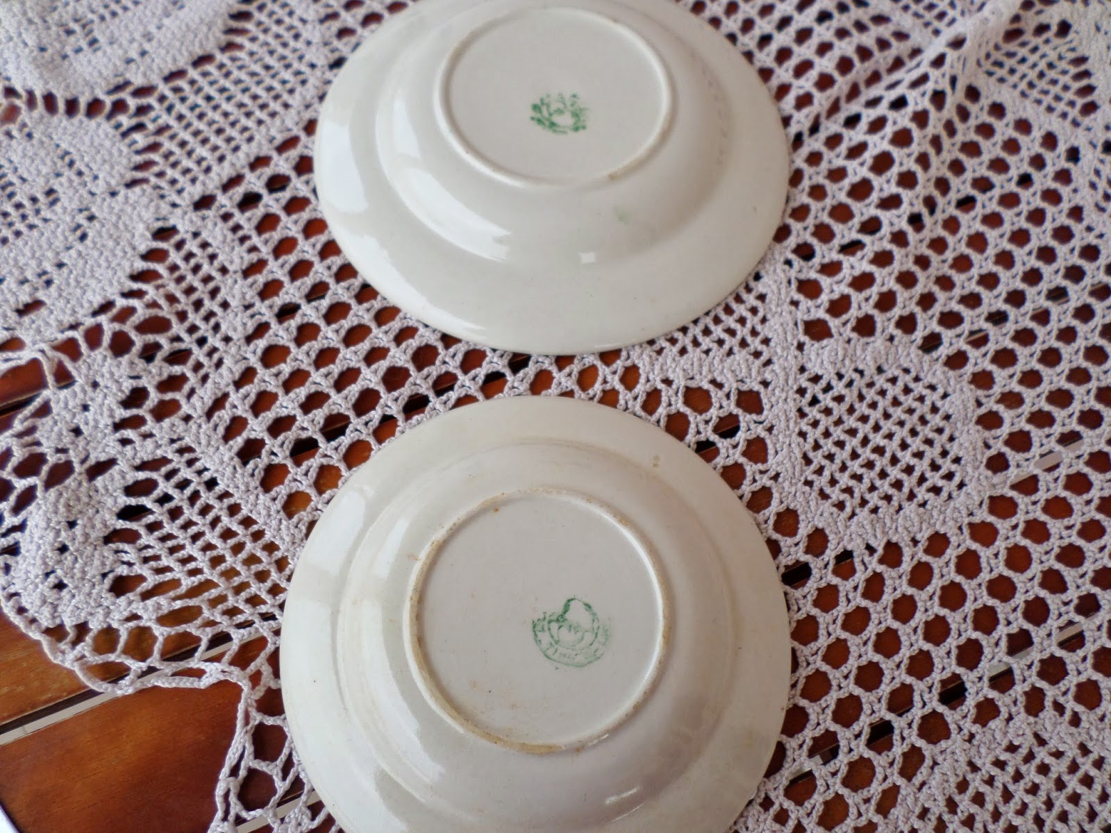 Comprei estes pratos ao meu amigo Fontinha na sua banca repleta deles de vários tamanhos.Ao escolher dois mais pequenos, porque na decoração os acho com mais graça, no rol da conversa, a dispersão, e com isso escolhi de marcas de fabrico esborratadas...
