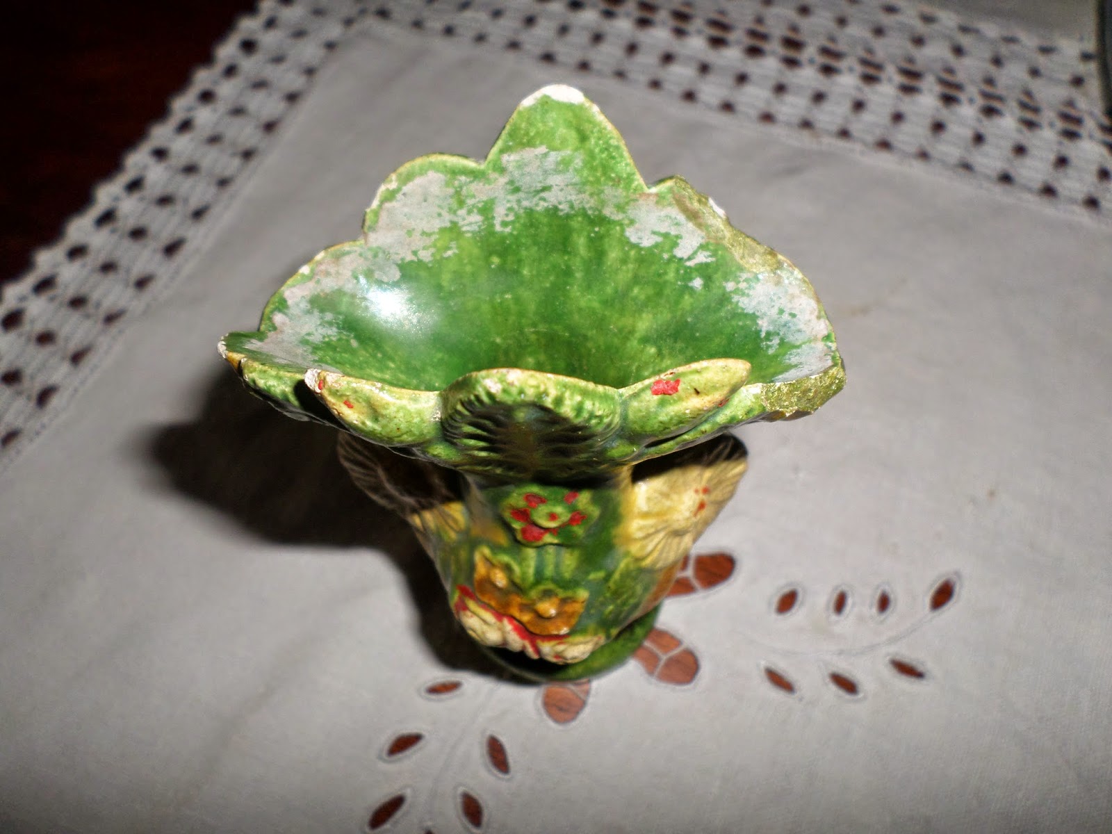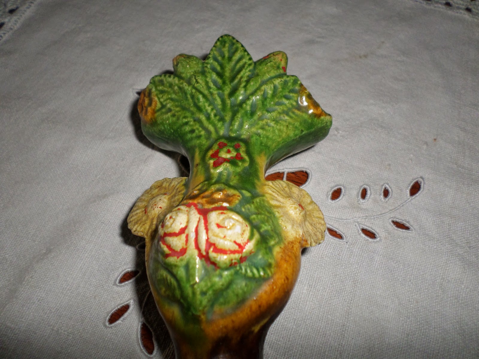 Decoração relevada na face do bojo com reserva em medalhão ovóide com ramos e flores encimada por outra pequena e dos lados apresentam-se outras flores tipo malmequer que formam as pegas.