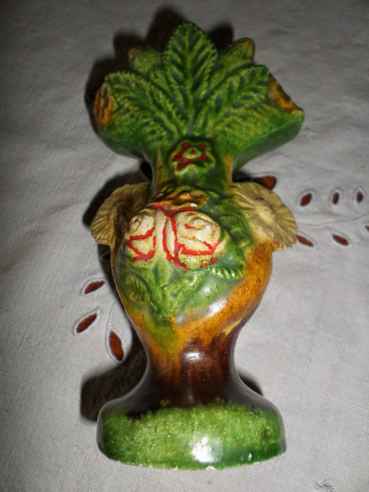 Peça em faiança vidrada e policroma a castanho camurça, amarelo torrado, canário e ocre, verde, e vermelho.