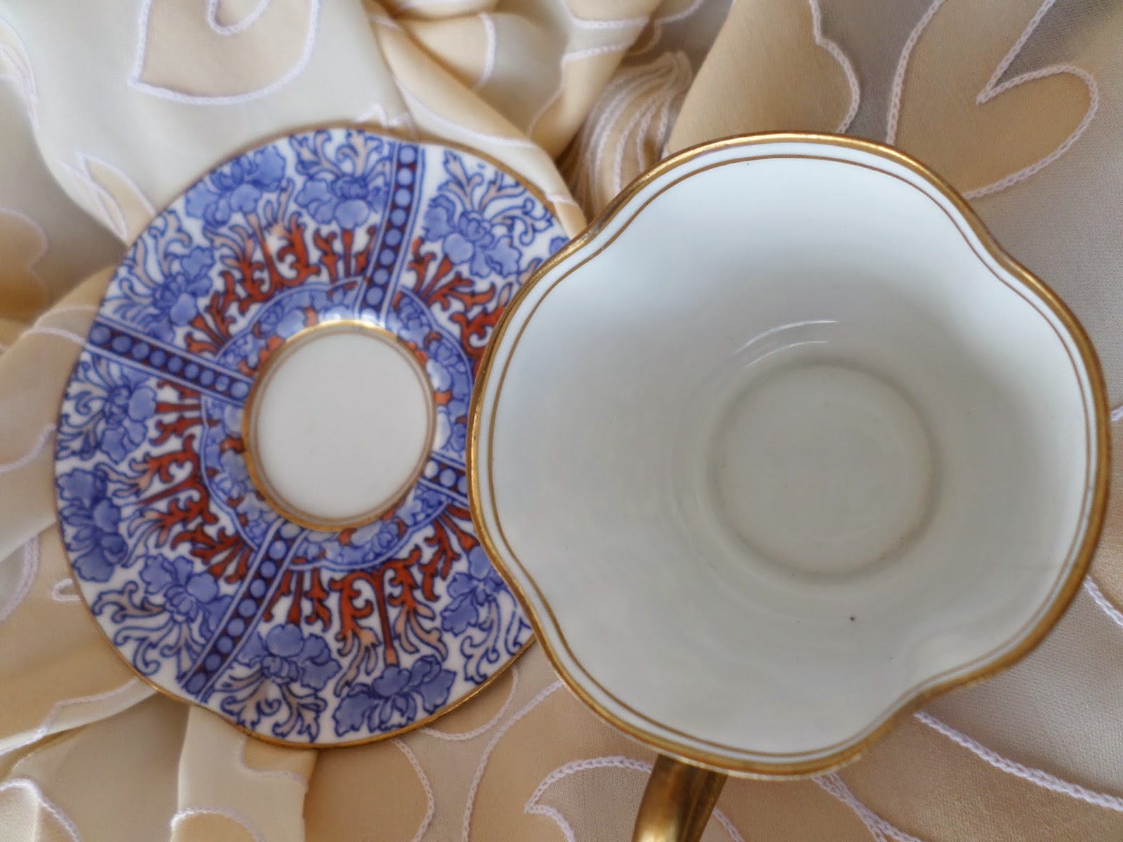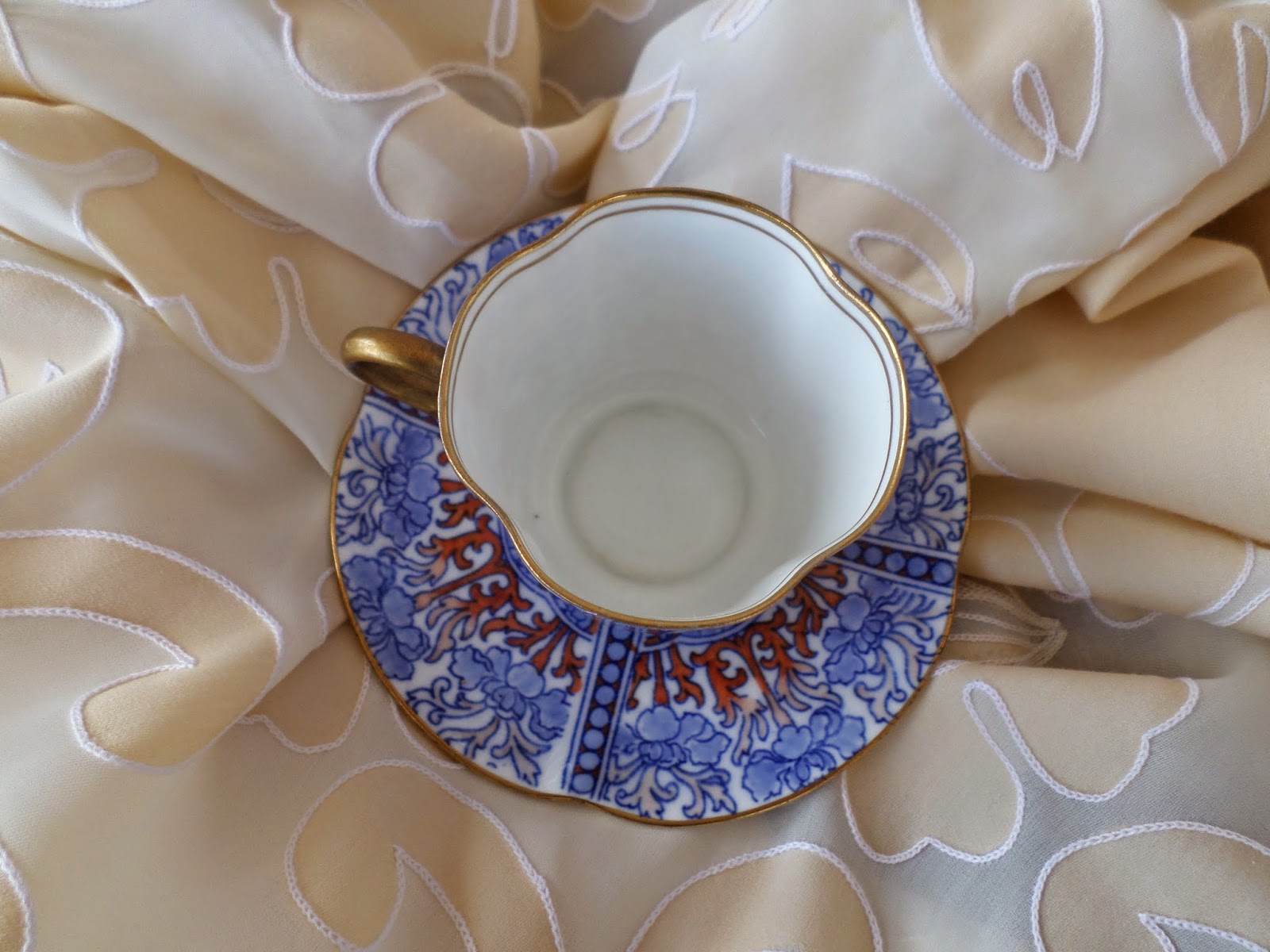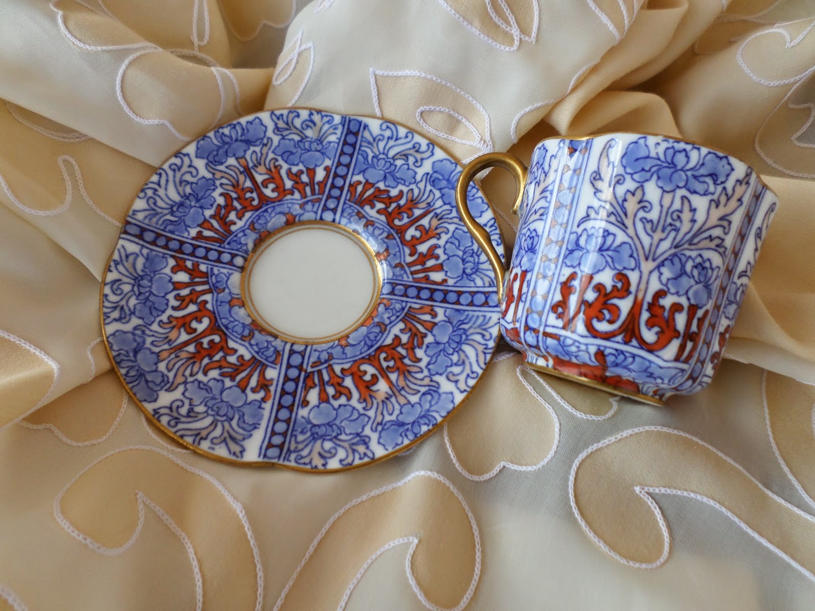 - A chávena com a mesma decoração do prato de rebordo ondulado debruado a filetes oiro no rebordo e por dentro da chávena tal como a asa.