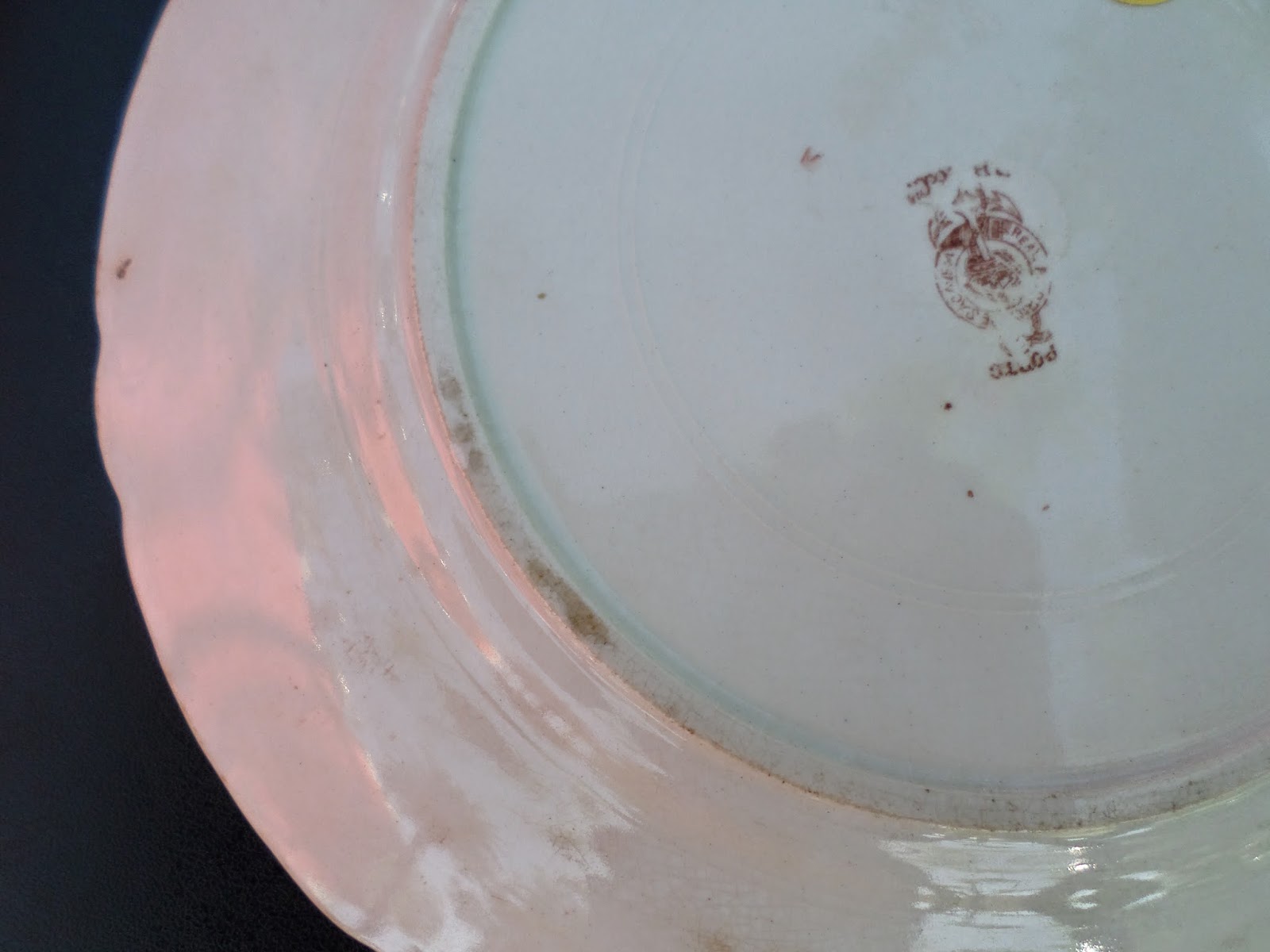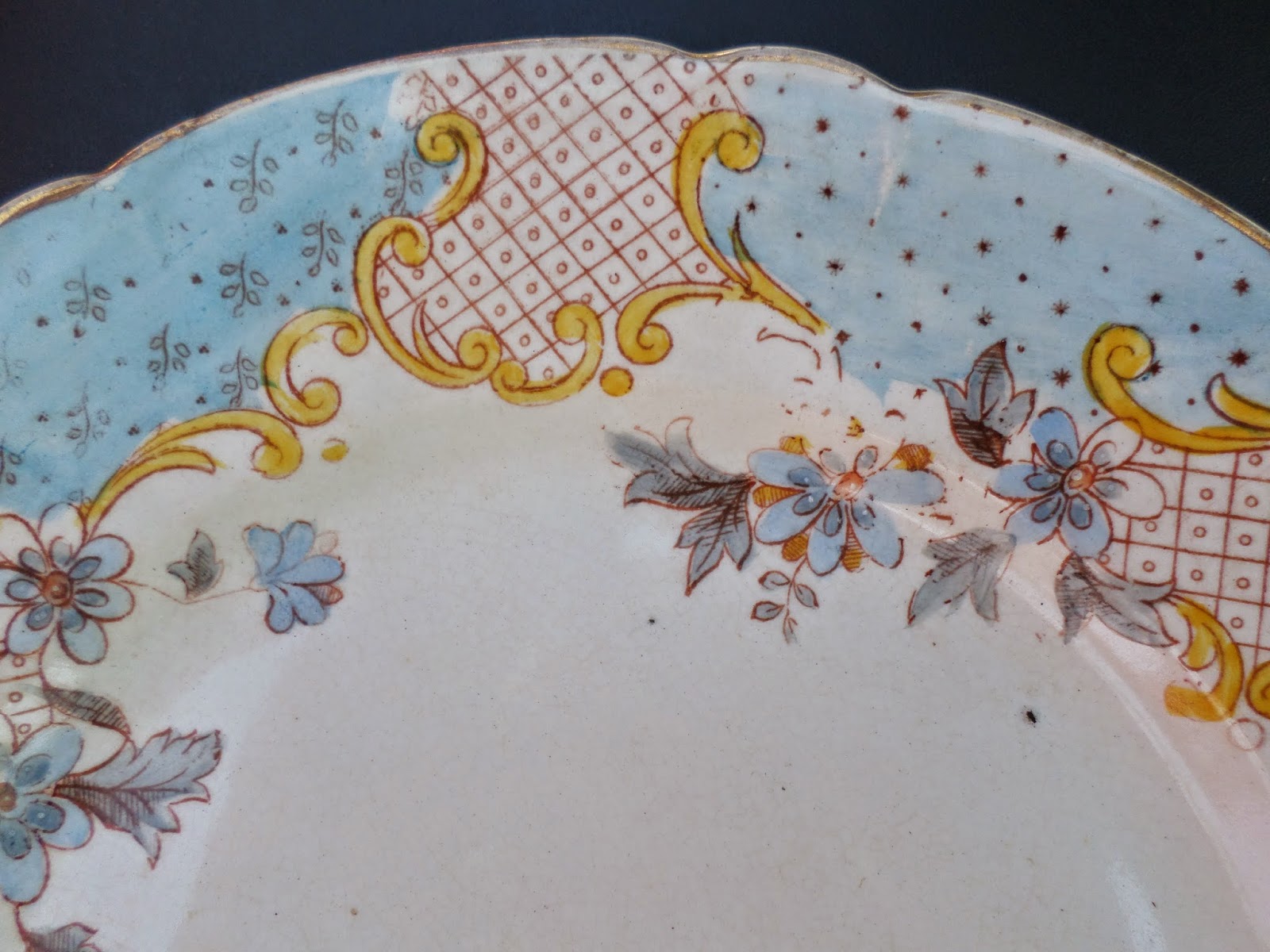- O rebordo apresenta-se recortado e pintado a dourado envergonhado(como os antiquários chamam, quando sumido, gasto) ornado a cercadura relevada.
