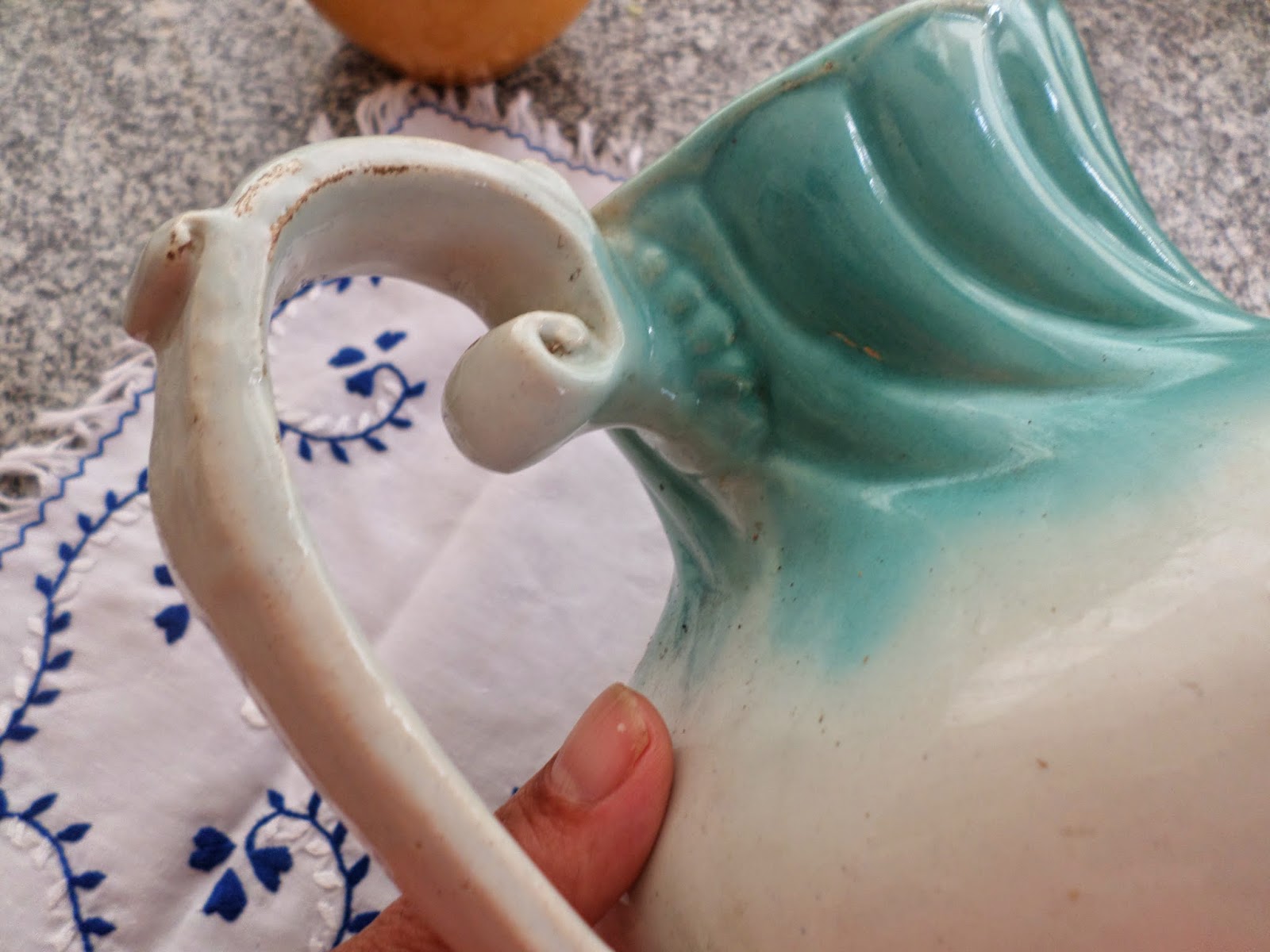 A asa é delicada com pormenor em relevo onde pega no gomil.