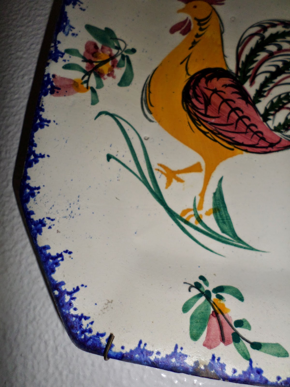 Travessa e pratinho com um galo no género de bordadura pintada , Aveiro seguramente pelas evidências: flores , galo e os bicos da aba.