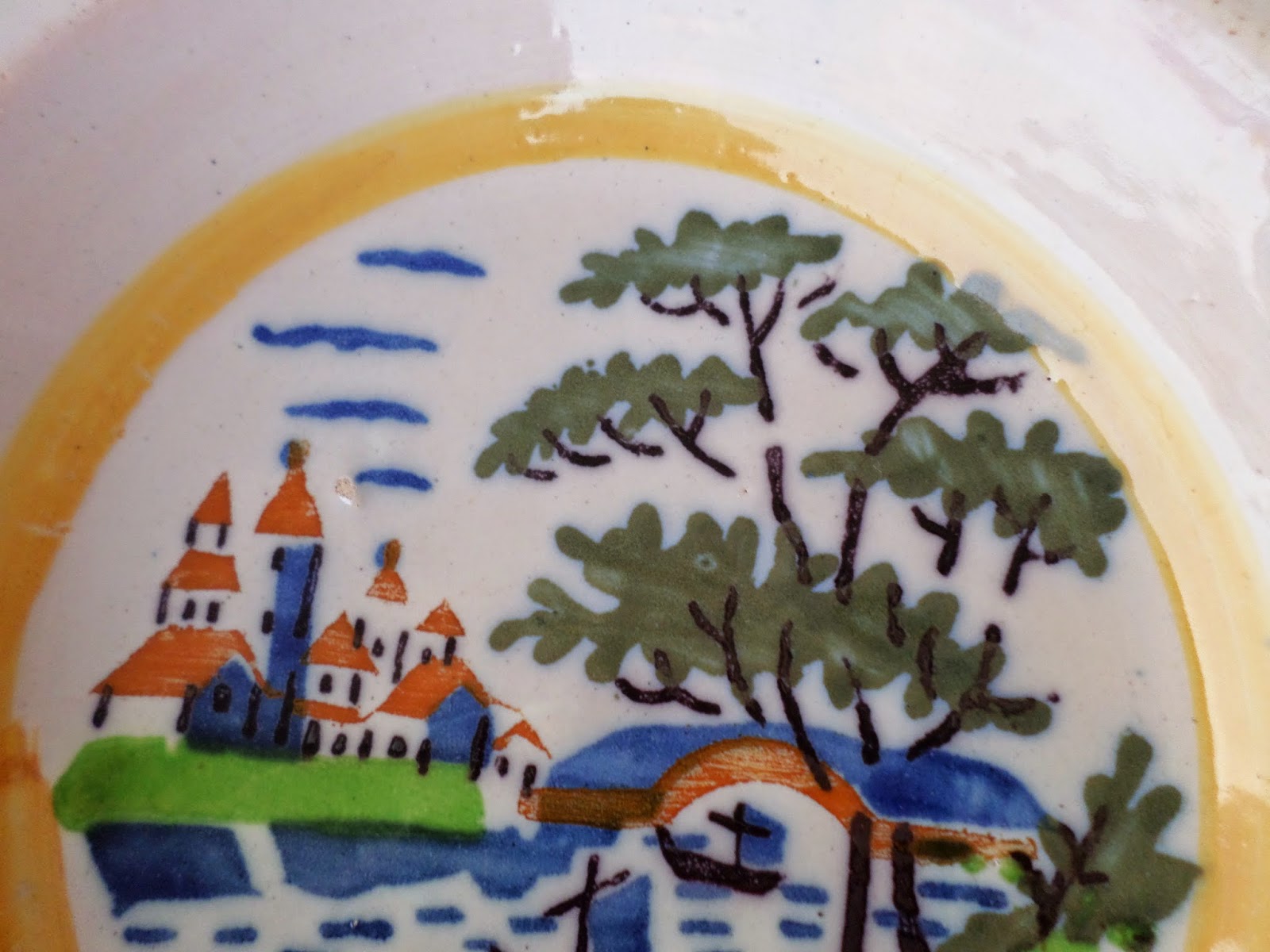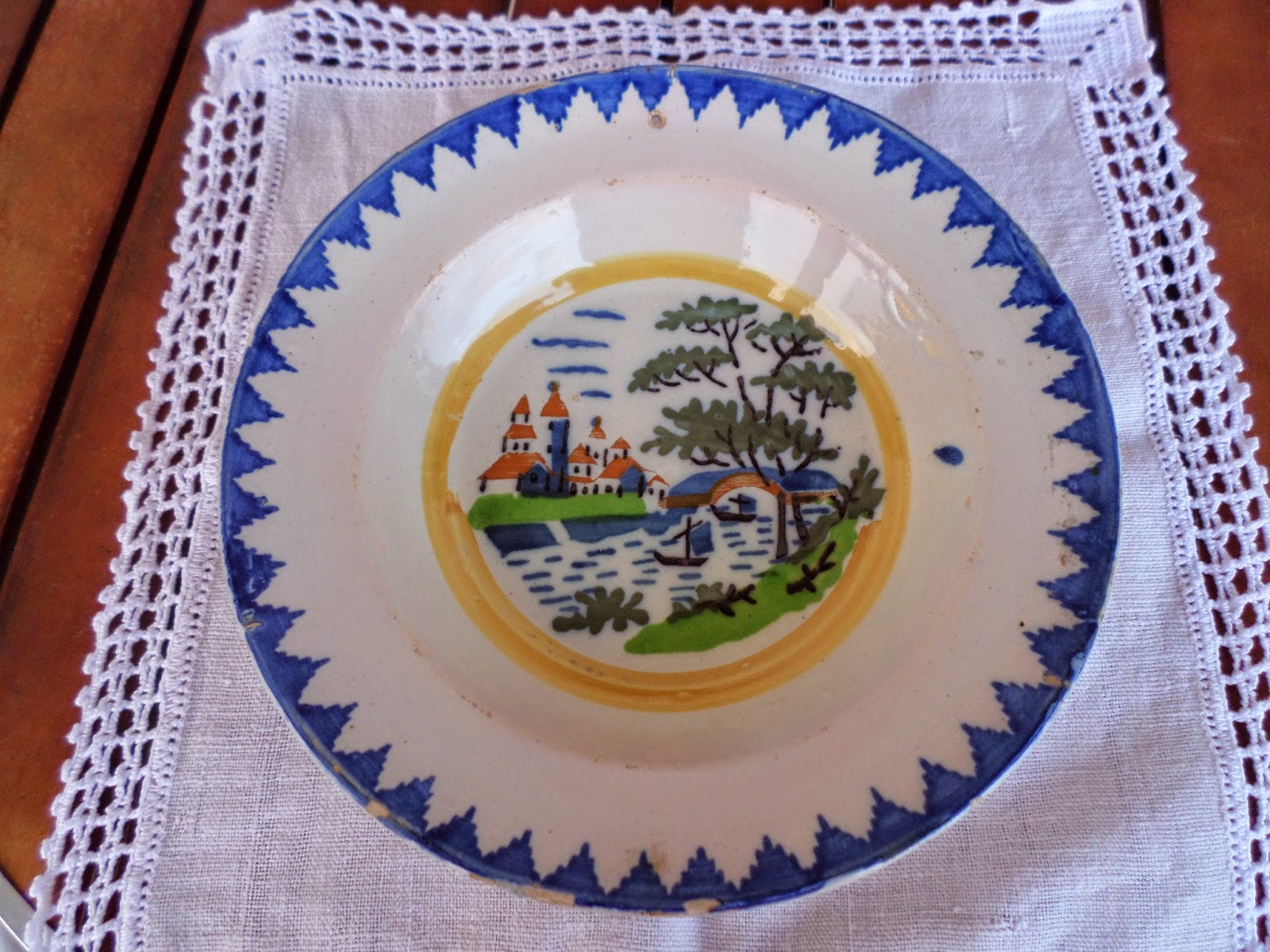 Por me lembrar o primeiro que conheci num prato de família, espólio de um padre, anos 30, região centro, que de herança só tinha peças atribuídas a Coimbra, o centro oleiro mais perto. Espólio que eu, e a minha cunhada herdamos juntamente com outro prato esponjado em manganês, escarradeiras e um bule de caldo além de penicos de massa malegueira. Sendo que o casario igual a este sem o rio, de formato igual, anos depois haveria de encontrar outro igual num antiquário da Sé, por ele pediam um dinheirão, sendo que nunca mais vi nada igual. Lamentavelmente por incompatibilidade com a pessoa em questão que é dona do referido prato não tenho, a foto para mostrar.