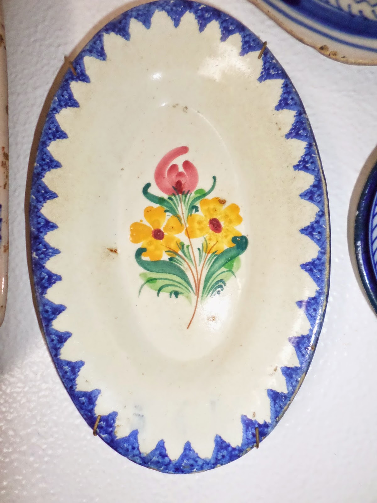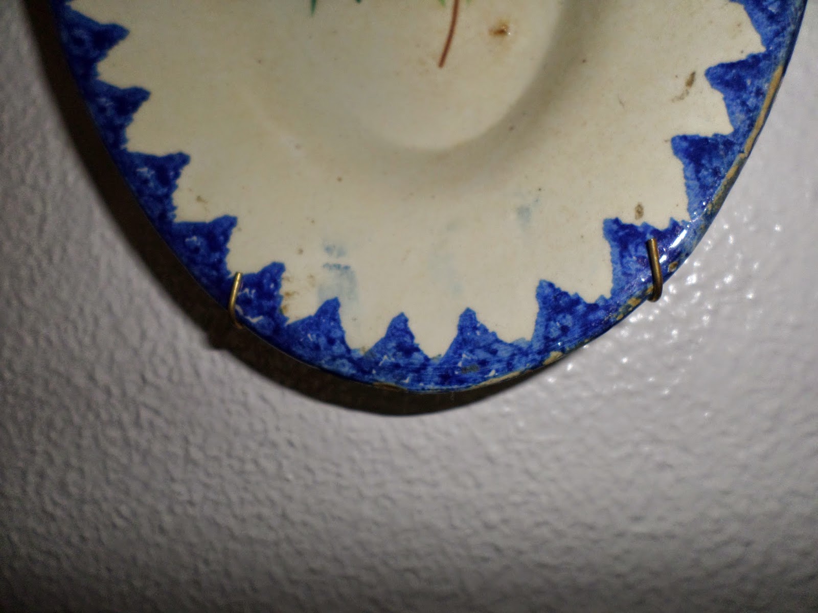 Curiosamente o prato apresenta um orifício na aba -, ao tempo muito carateristico, feito por um aparelho giratório usado para fazer furinhos para a colocação de "gatos" na faiança quando esta se partia e assim de novo nova.