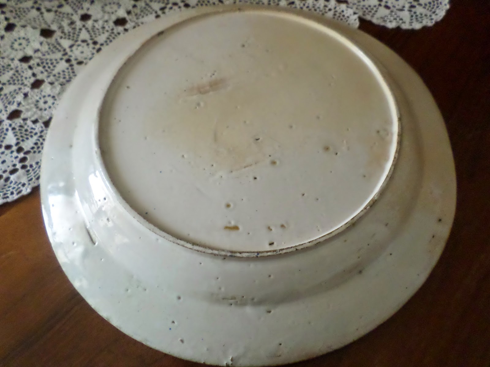O prato tem um diâmetro de 36,5 cm, é muito leve e de excelente vidrado, ao centro nota-se um pouco craquelê.