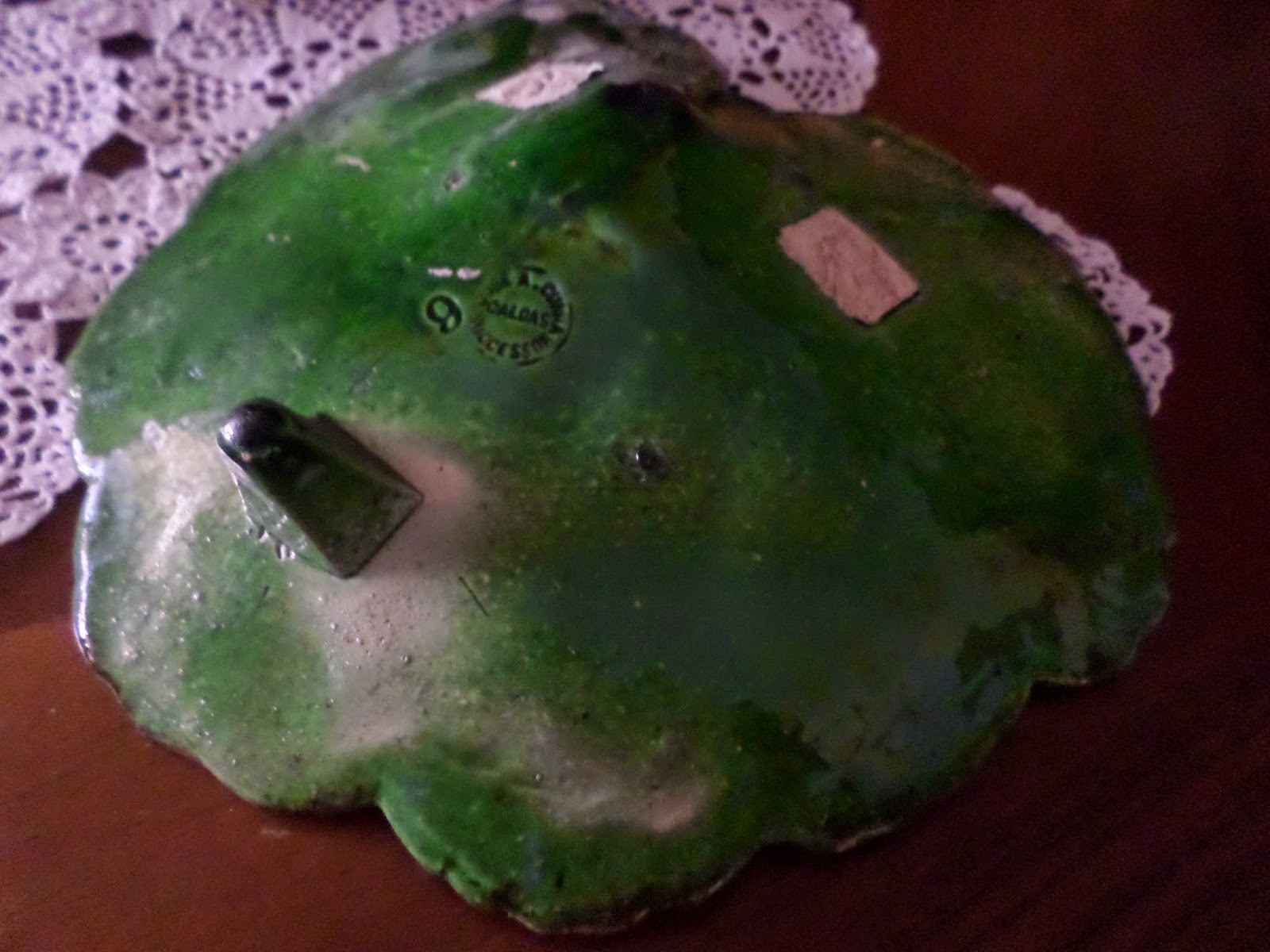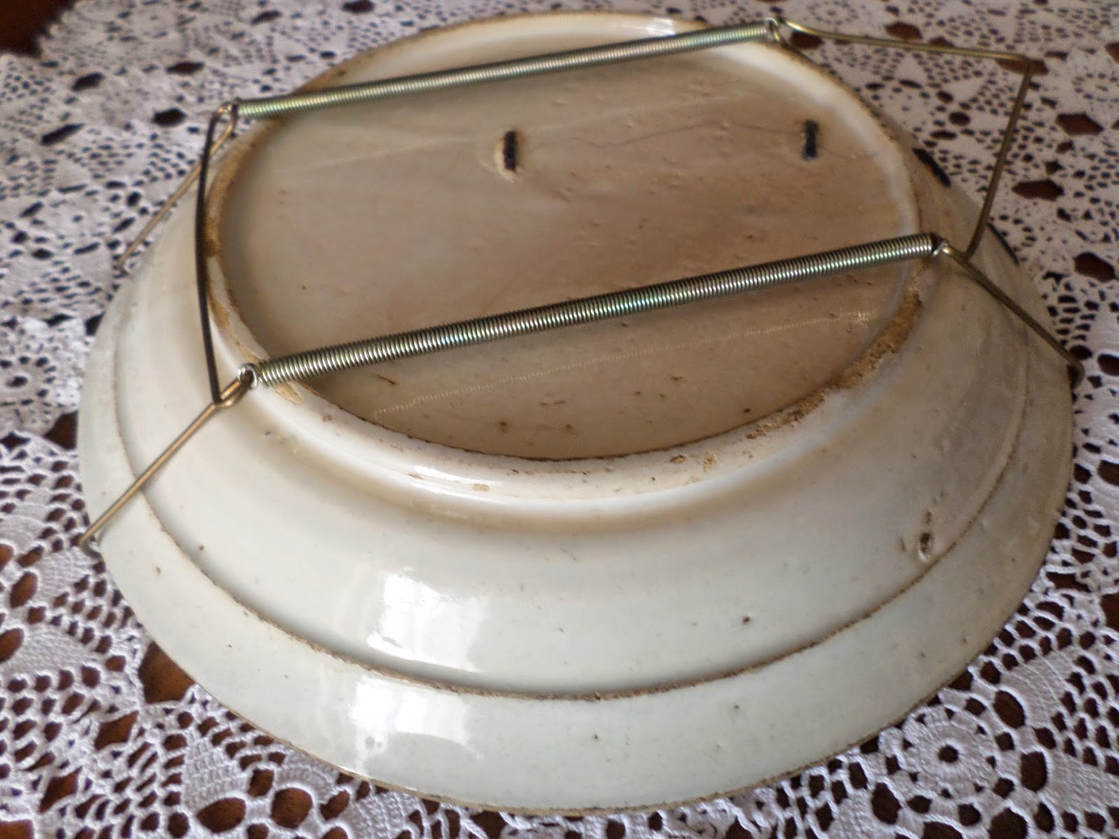 As fotos são as possíveis da banca. Esteve pendurado anos a fio numa parede húmida, a aranha estava toda ferrugenta e o prato no tardoz igual, mas o esmalte exalava um brilho sem igual , no contraste da tonalidade azul e laranja no contraste do manganês e verde esbatido .