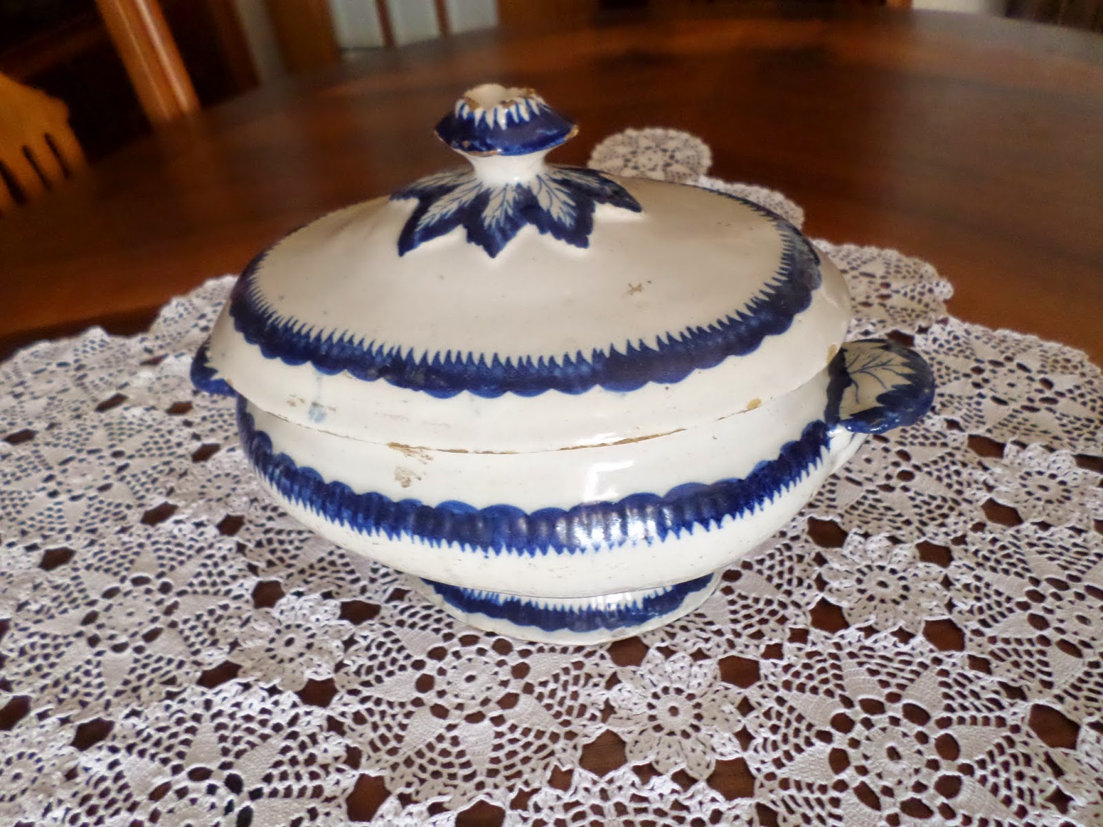 Terrina seguramente de fabrico norte, com motivo inglês shell edged pearl ware, vastamente produzido por SAVP. Apresenta bom esmalte a chumbo, o pé da terrina é muito semelhante a congéneres assinadas da SAVP.