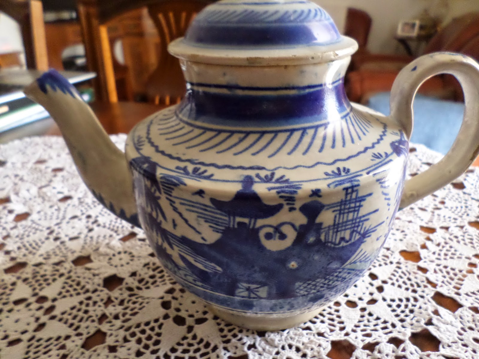 Bule também catalogado Miragaia. Tem uma curiosidade a tampa é de esmalte mais brilhante do que o bule, no caso casam bem, mas por certo não serão da mesma peça?O desenho, os pormenores do pagode e o frete do pé revelam ser com muita segurança SAVP ou Vilar de Mouros (?).