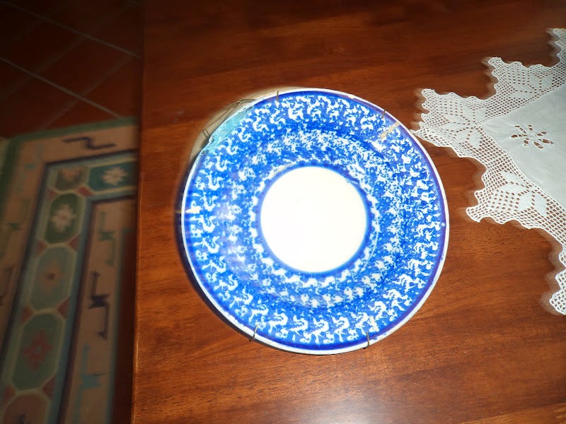 Prato da minha coleção em esponjado delimitado por filete mais escuro no limite do centro e do rebordo.Esmalte radioso, pode ser produção de SAVP(?)