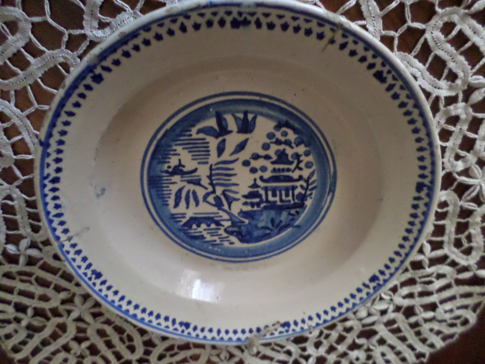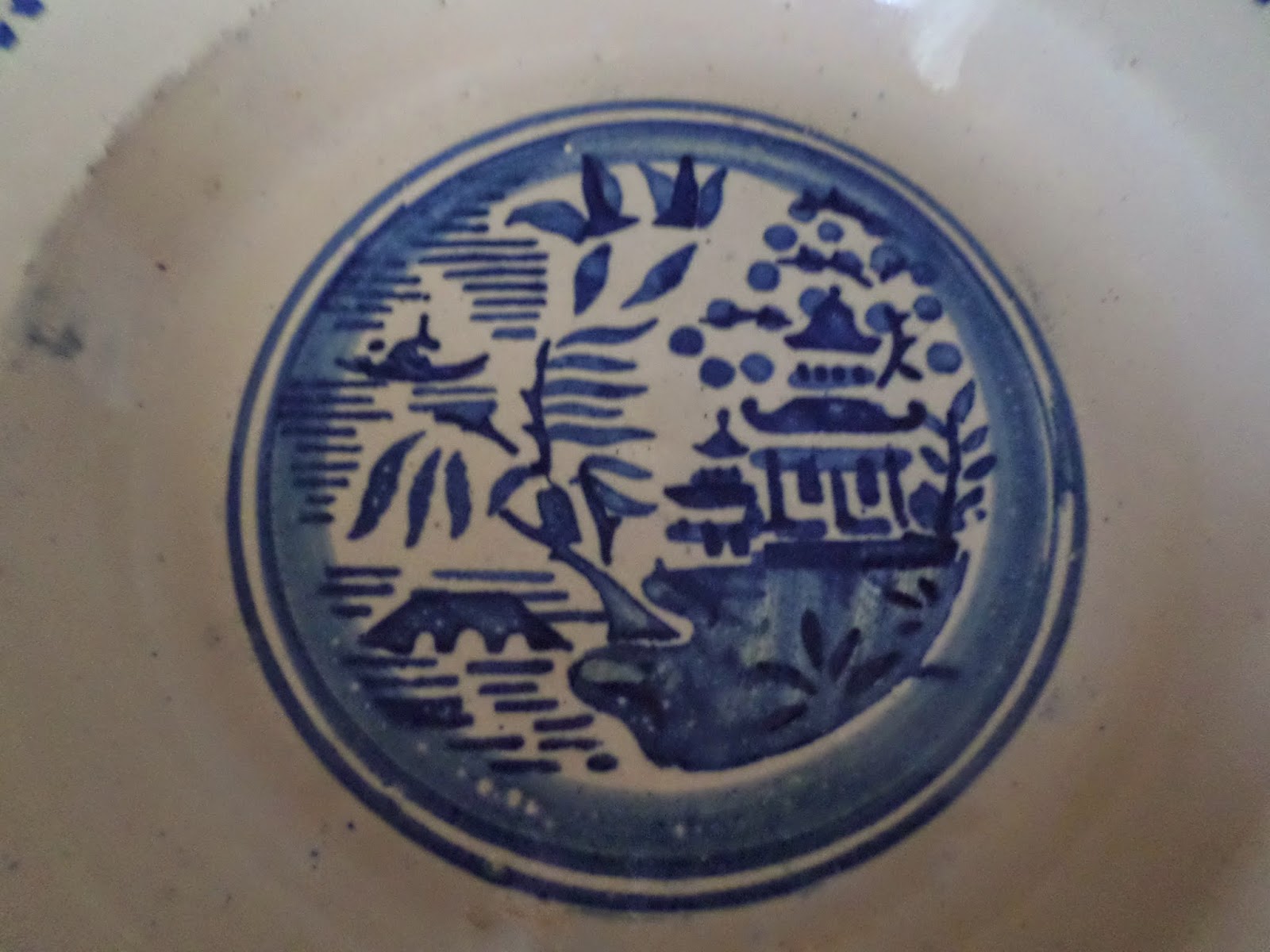 Prato em monocromia azul e aguada sob esmalte amarelado. Apresenta- se ao centro fechado por um filete circular seguido de outro largo em aguada onde nasce a decoração do motivo Willow onde não falta a ponte, barco, pombos (amantes), salgueiro e os pêssegos no tardoz do pagode  sob rodapé em aguada.