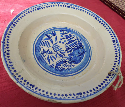 Mais um prato com "furinho" na aba que encontro em 99% de faiança do centro do País, um hábito as pessoas humildes os penduravam por falta de armários, este ainda traz o cordel.