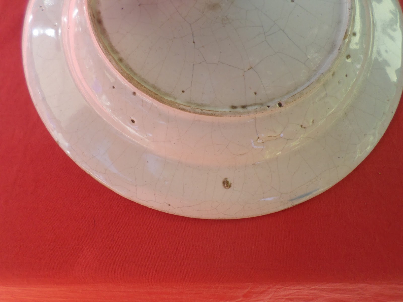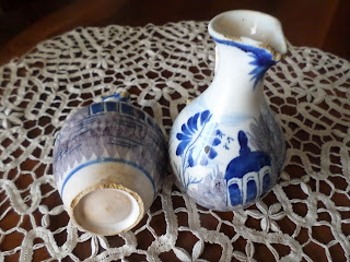 O vendedor vendeu-mo como sendo Miragaia. Balanço a possibilidade de ser SAVP (?). Peça de molde e as galhetas feitas à roda, a pintura do manganês mostra-se arrepiada (na pega da tampa é bem visível), e pelo barro ligeiro em cor rosada( por não terem no norte barro branco, vinha de Lisboa e outras proveniências, misturavam com vermelho que era abundante na região, por isso os arrepiados de matérias plásticas que se notam no pé das galhetas).