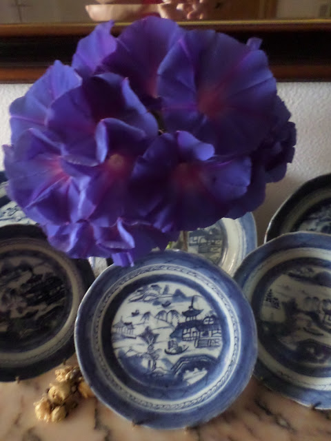 Não havia segurança no parque, saí do carro, ao longe senti gente por entre pedras enegrecidas de musgos, junto do cais do Porto Brandão, na apanha de algum marisco, deleitei-me com a encosta , debalde sem máquina para registo de momentos-, obelisco em argila que o tempo desgarrou da falésia, fiquei-me na apanha de petúnias trepadeiras-, flores em azul tucano, em olho rosa ciano, mal cheguei a casa não resisti pô-las junto dos meus pratos em cantão China, melhor mote para mostrar mais uma vez o nosso "cantão popular".