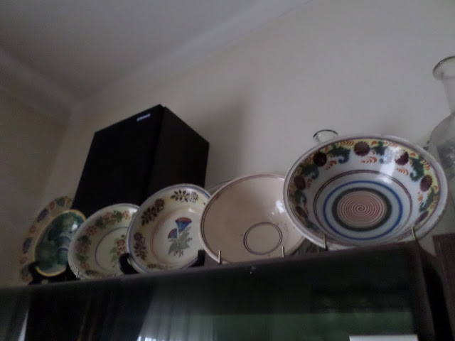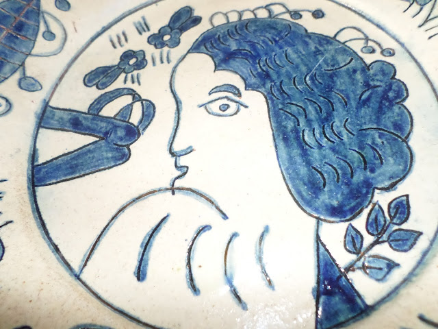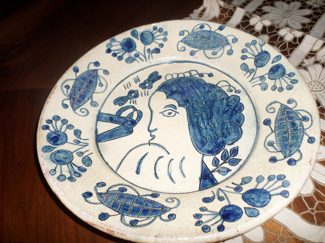 Ontem na feira de velharias do Montijo, encantei-me com um prato de artesanato em cerâmica do Redondo, Alentejo, por se mostrar numa decoração rara, habitualmente privilegiam a pintura de paisagens alentejanas com as searas, sobreiros e azinheiras, casario baixo com grandes chaminés, e variedade de flores. Encantei-me pela pintura azul, pelo rosto feminino central que logo me reportou para os" pré ratinho do Brioso "em Coimbra...Faiança belíssima e caríssima, no mesmo modo para os ditos aranhões-, afinal decorações do século XVII. Dificilmente adquiro uma peça em artesanato de olaria, comprei há mais de 30 anos em Santarém, no primeiro festival gastronómico, a um oleiro algarvio dois belos pratos, um que ainda tenho com a típica casa alentejana,o seu forno e a piteira pela frente( porque me faz lembrar do episódio no 5º ano, que ninguém da turma sabia o significado de piteira empoeirada na beira da estrada -, e claro a professora mandou que todos escrevessem 50 vezes o que dizia no dicionário ...planta da família das amarilidáceas, de folhas espessas, carnudas, fibrosas e espinhosas, subespontânea em Portugal que se vêem nas ribanceiras das estradas ...Comprei ainda outro prato com uma aldeia e igreja que ofereci à minha irmã.