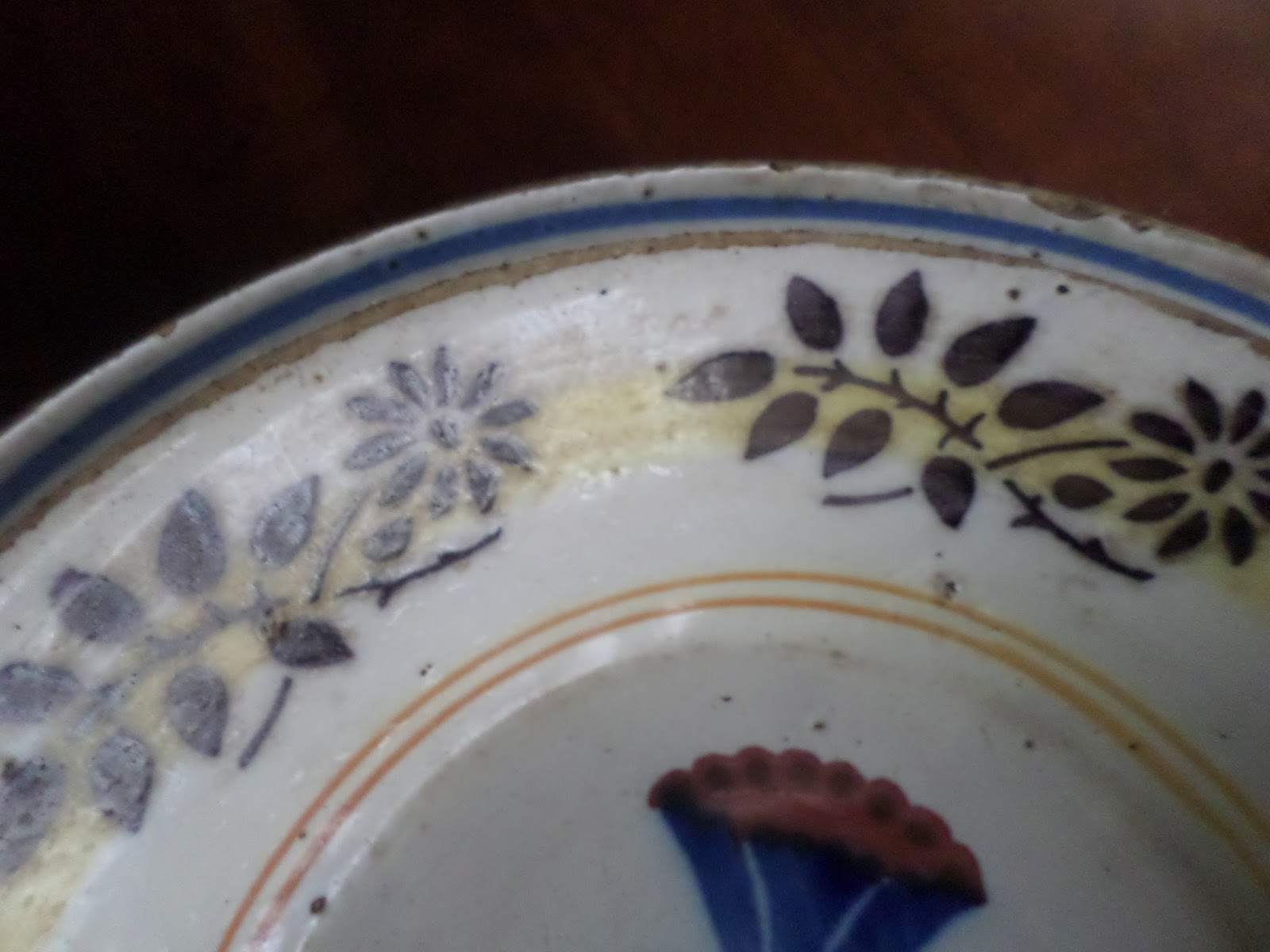 Esta cativou-me pela decoração, que nunca vi nada igual, sobretudo a decoração central com um ramo de petúnias(?)  em policromia azul, vermelho e branco, ramagens em castanho, e folhas em verde esbatido, ao limite do covo uma dupla de filetes finos em amarelo ocre. Na aba ramagens de flores em castanho e sobre elas sobreposto um filete largo em amarelo ocre. Ao limite do rebordo  quebrado um filete em azul.